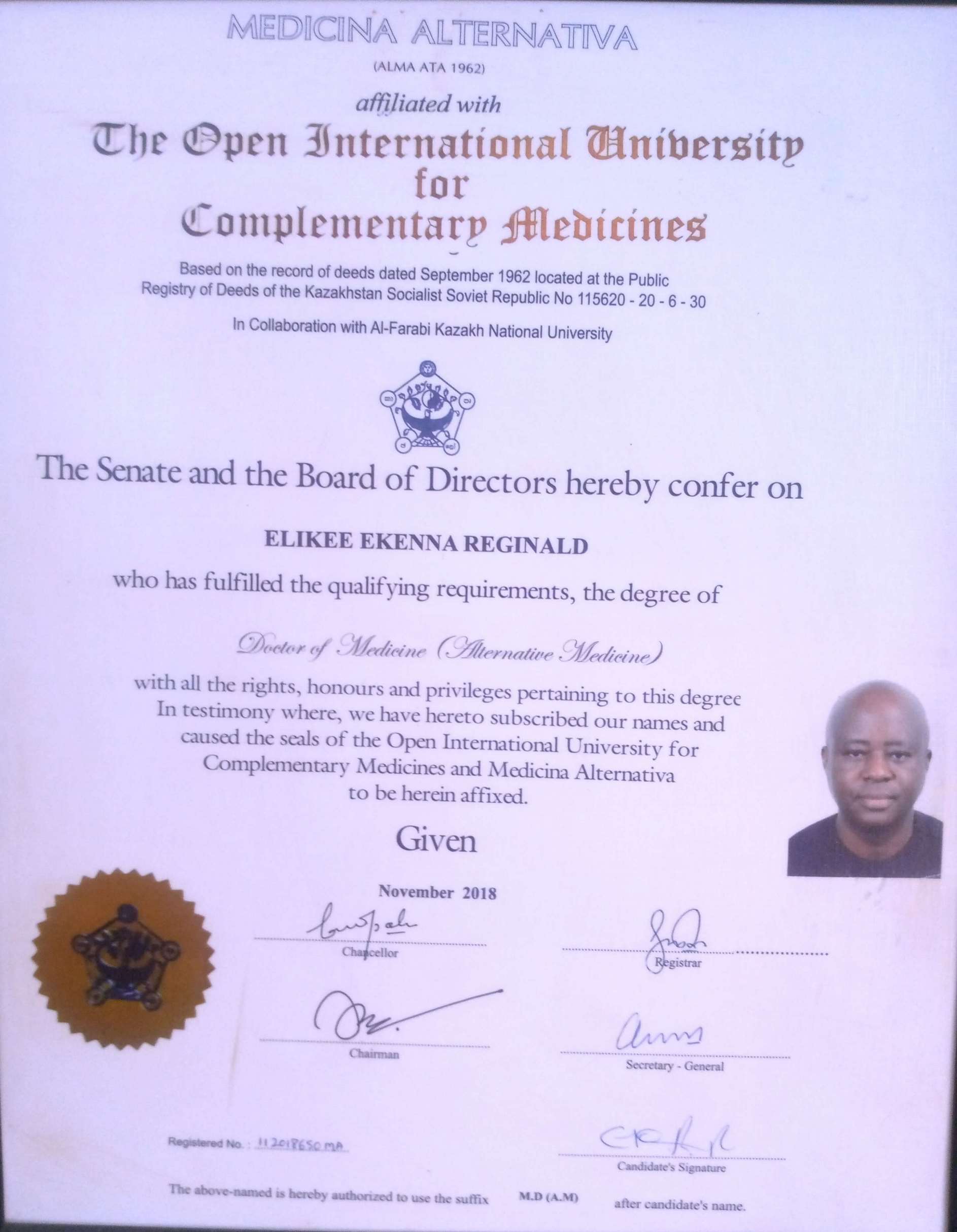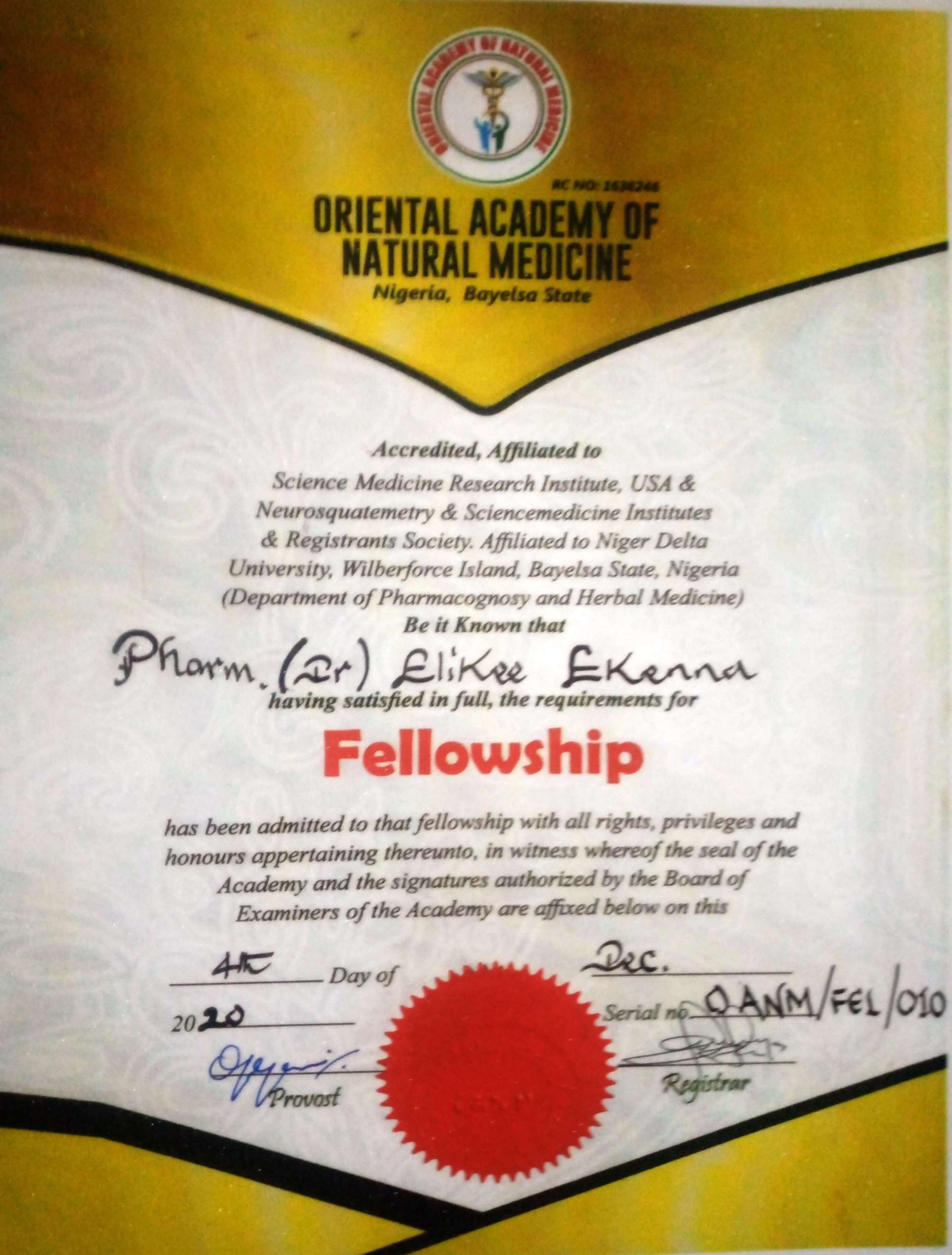 Award of Fellowship by the Oriental Academy of Natural Medicine, Bayelsa State, Nigeria