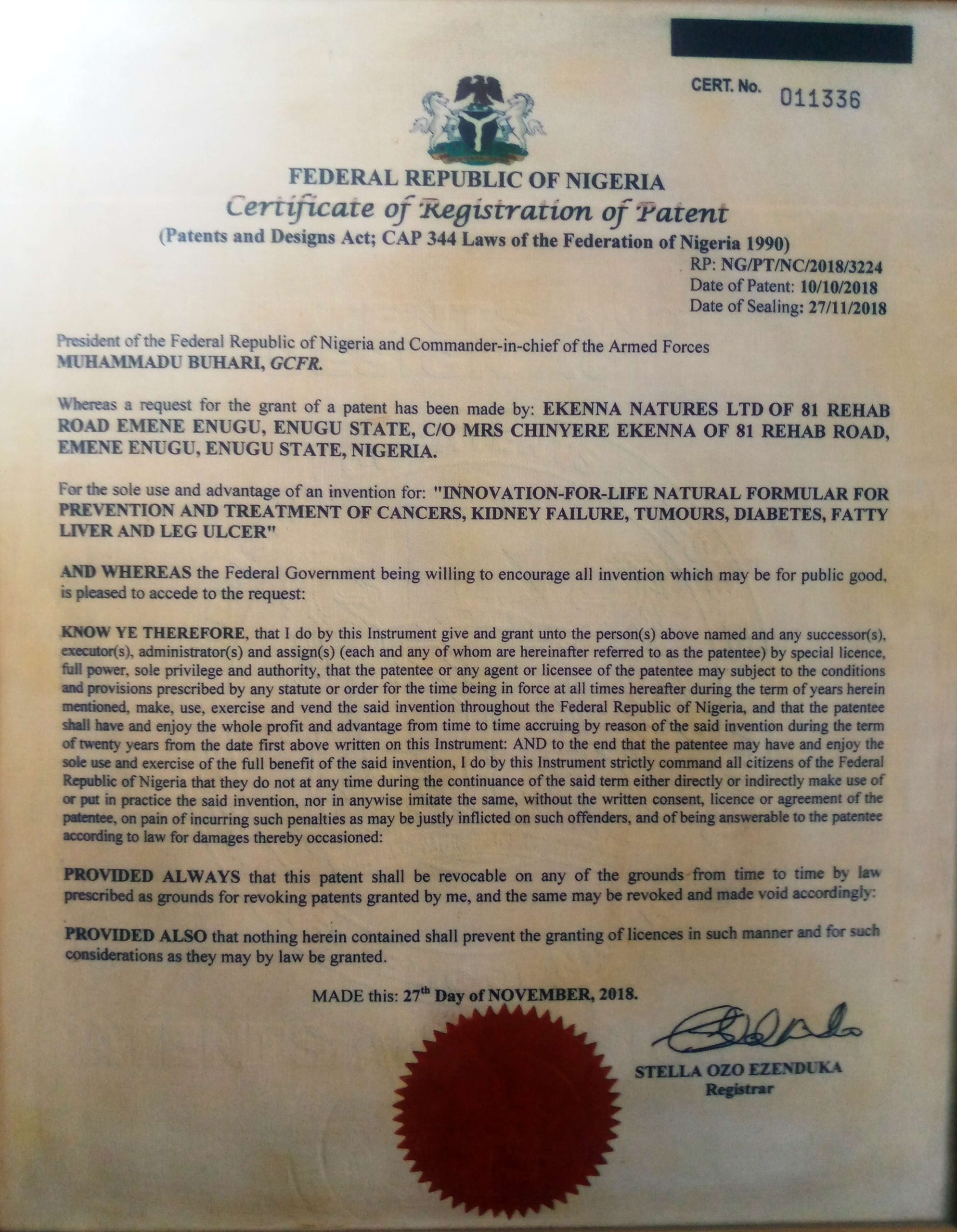 Certificate of Registration of Patent from the Federal Republic of Nigeria
