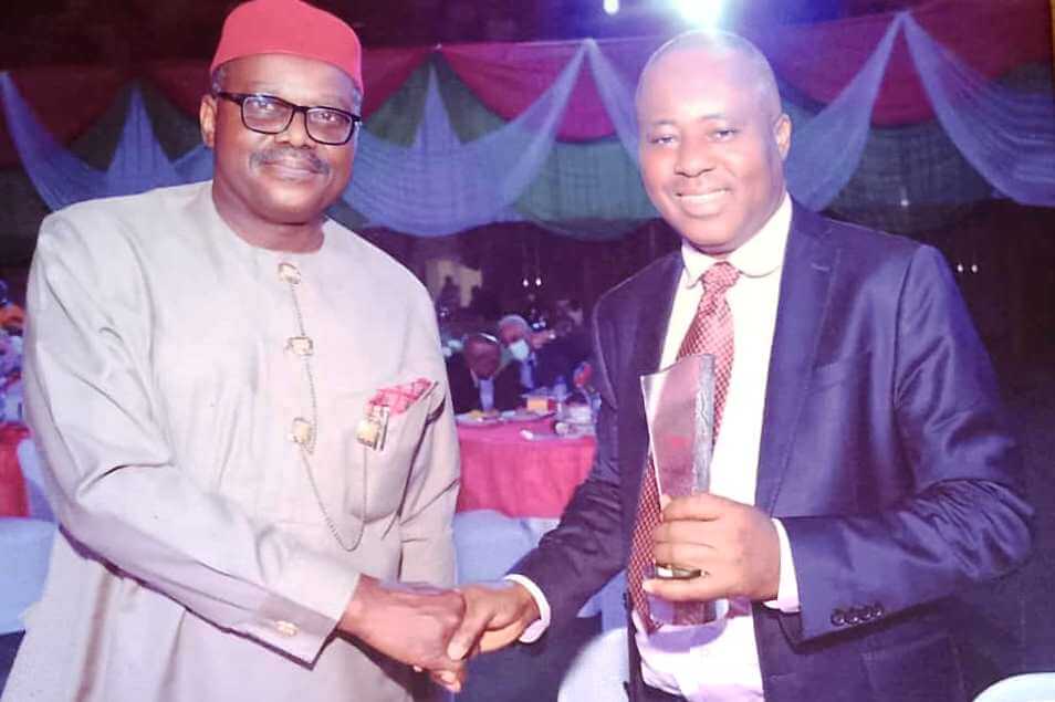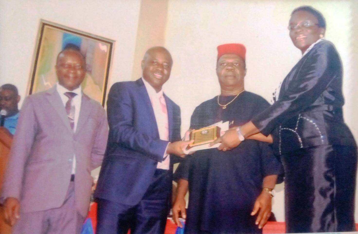 Former Minister of Health, Prof. Onyebuchi Chukwu appreciating Pharm (Dr) Ekenna on his Merit Award from the Association of General and Private Medical Practitioners of Nigeria (AGPMPN) in August 2021 in Abuja, Nigeria